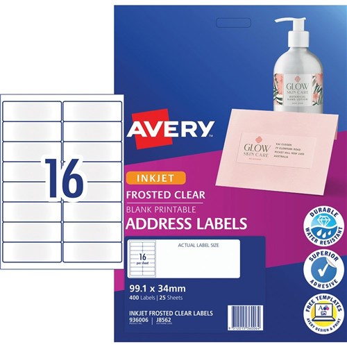 Avery Frosted Clear Inkjet Address Labels J8562 99.1x24mm 16UP 400 Labels