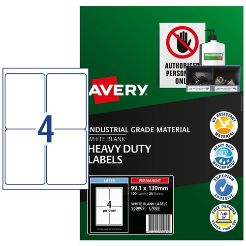 Avery Identification Laser Heavy Duty White L7069 99.1x139mm 4UP 100 Labels