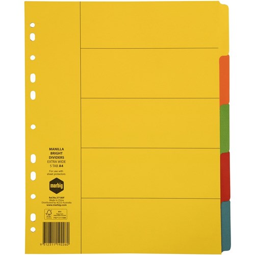 Marbig Manilla Indices & Dividers A4 Extra Wide 5 Tab Bright Colours