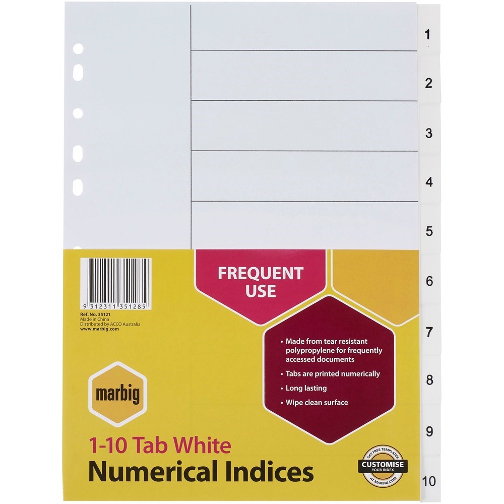 Marbig Plastic Indices & Dividers A4 Indices 1-10 White
