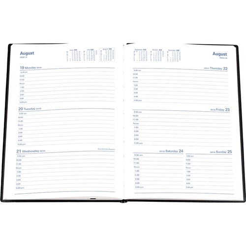 • Stylish hardcover casebound diary with blue leather grain cover.
