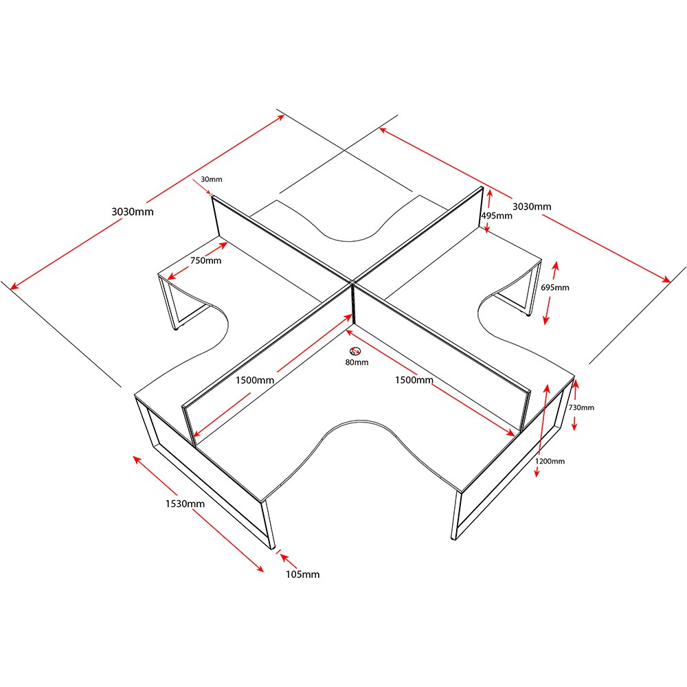 • Overall Including Screen: 3030mm W x 3030mmW x 780mm D x 1200mm H. Per User: 1500mm W x 1500mmW x 750mm D. Desk Height: 730mm.