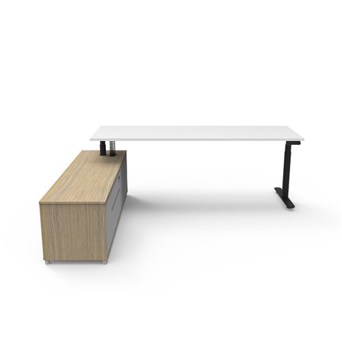 • Natural White top and Black Satin frame. Height adjustable desk with left hand side cabinet.